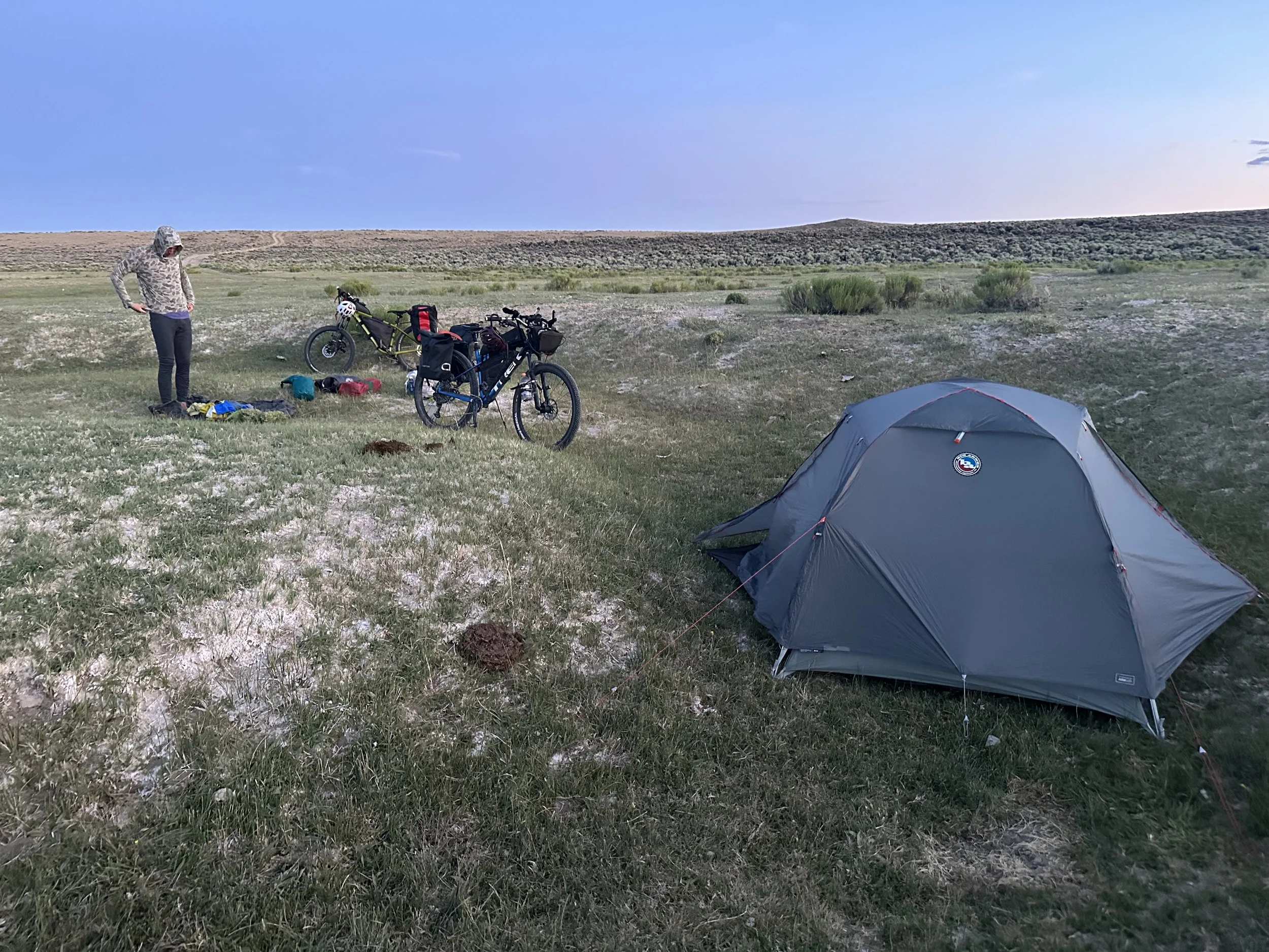 One person we spoke to who was traveling north and had already been through the Basin said the winds were so strong they broke a tent pole. Another showed us a photo of the dust and sand INSIDE her tent from a dust storm. That in mind, we chose as low a spot as we could find to pitch the tents. Turned out to be a calm, quiet night.