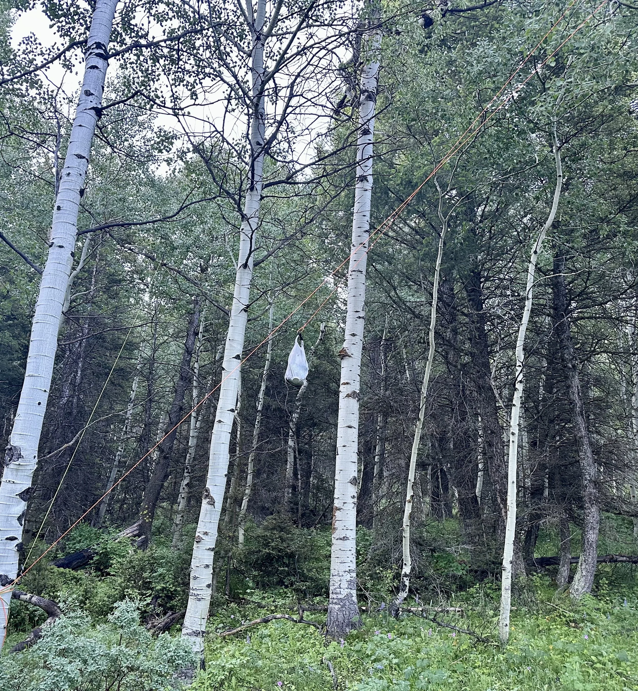 Lots of times, if we stay the night in a US Forest Service campsite, there are bear-safe boxes where we can stash our food, but when we are “wild” camping, you have to hang your food in trees, six feet from the trunk and 12 feet off the ground.
